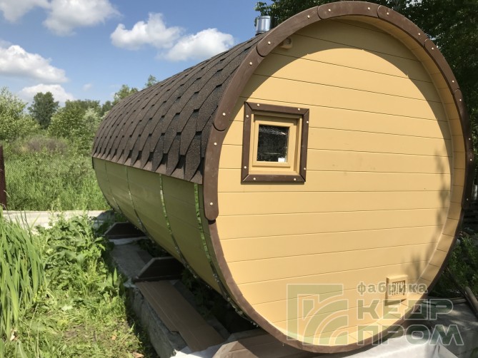 Круглая баня-бочка длиной 4,5 метра с входом сбоку. Данная модель бани будет удобна в первую очередь расположением и планировки и застройки участка таким образом, что вход возможен только с передней стороны фасада. А также внутреннее пространство может показаться более удобным и комфортным в сравнении с классическим входом с торца.