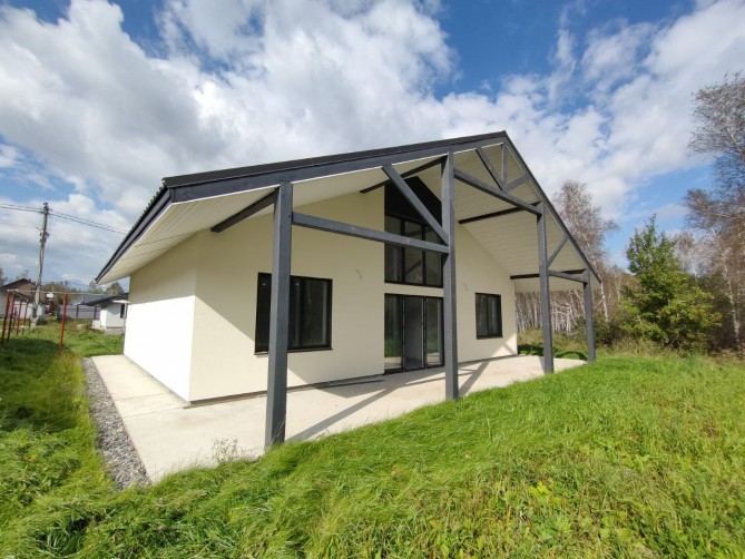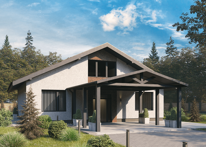 Дом функционально разделен на зоны кухни-гостиной, спального блока «детские» и спального блока «мастер спальни». Кухня-гостиная расположена в середине дома. Парковка для авто выполнена под навесом, рядом с главным входом в дом. Терраса находится под одной крышей с домом. Дом сдается в отделке white box. Гипсовая штукатурка Knauf под обои.